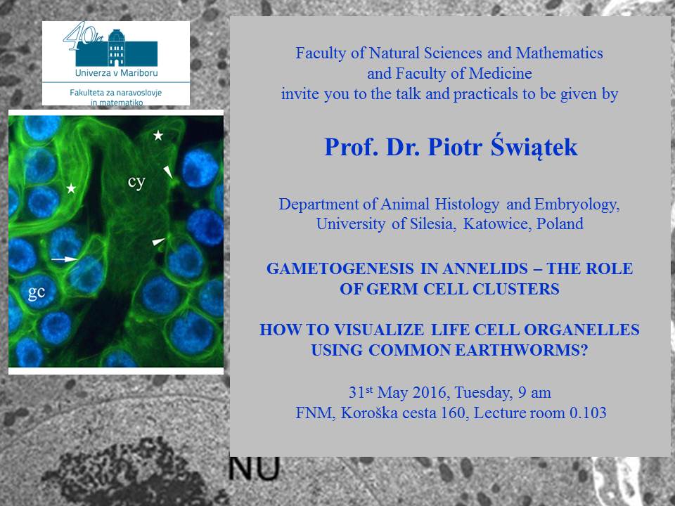Prof. dr. Piotr Świątek z Oddelka za histologijo živali in embriologijo, Šlezijska Univerza v Katowicah, bo predaval o gametogenezi pri kolobarnikih. Predavanje bo v torek, 31. 5. 2016, ob 9.00, v predavalnici 0.103, FNM.