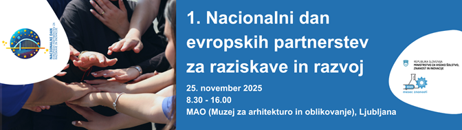 Ministrstvo za visoko šolstvo, znanost in inovacije (MVZI), Direktorat za znanost in inovacije vabi na 1. nacionalni dan evropskih partnerstev za raziskave in inovacije, ki bo v torek, 25. novembra 2025, med 8.30 in 16. uro, v prostorih Muzeja arhitekture in oblikovanja – MAO (Grad Fužine) v Ljubljani.