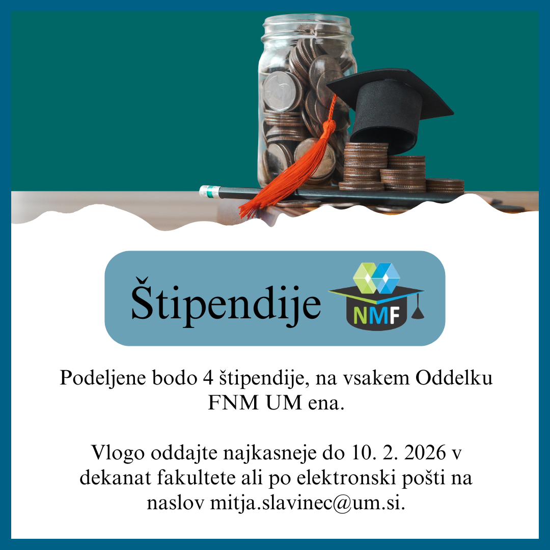 Naravoslovno matematična fundacija (NMF) razpisuje 4 štipendije za izjemne študente na Fakulteti za naravoslovje in matematiko Univerze v Mariboru (FNM). Razpiše se ena štipendija za vsak oddelek na FNM.