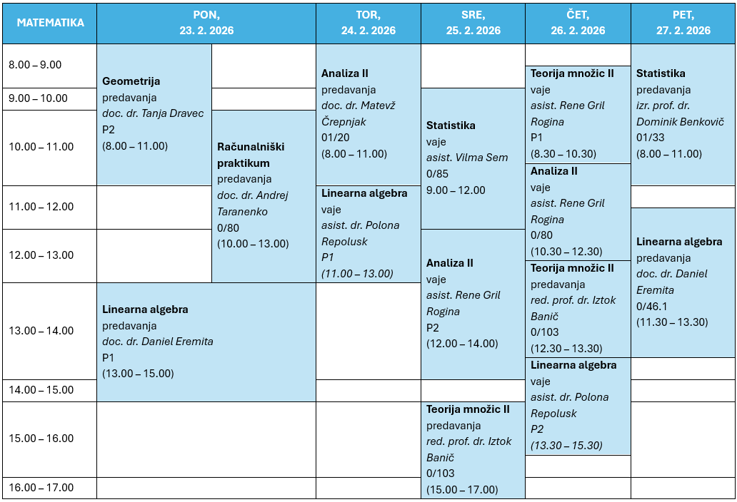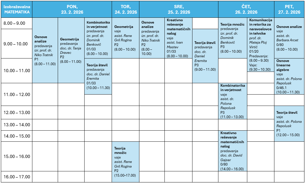 Študent za en dan 2026 – urniki Študent za en dan Študijski program: Biologija in Ekologija z naravovarstvom Fizika Matematika Predmetni učitelj: smer biologija in smer kemija smer fizika smer matematika smer računalništvo in smer tehnika ŠTUDENT ZA EN DAN Informacije za vpis Aktualne informacije za bodoče študente FNM Moja um na fnm DODIPLOMSKI študijski programi - Biologija - Ekologija z naravovarstvom - Fizika - Matematika ENOVITI MAGISTRSKI študijski program Predmetni učitelj s smermi: - Izobraževalna biologija - Izobraževalna fizika - Izobraževalna kemija - Izobraževalna matematika - Izobraževalno računalništvo - Izobraževalna tehnika MAGISTRSKI študijski programi - Biologija in ekologija z naravovarstvom - Fizika - Matematika - Izobraževalna matematika - Izobraževalna tehnika Študijski programi DOKTORSKE ŠOLE - Ekološke znanosti - Fizika - Matematika - Tehnika - področje izbobraževanja Študent za en dan moja.UM UI v pedagoškem procesu FNM brošure Alumni FNM Novice Dianoia UM 50 let O FNM Osnovni podatki Urniki Kje smo Seznam zaposlenih AIPS PPA Intranet - ERMan E-pošta - zaposleni Študij na FNM Za bodoče študente Urniki Knjižnica Erasmus+ mobilnost študentov AIPS E-študij UM E-pošta - študenti Raziskovanje na FNM Inštituti na FNM Programi in projekti Izpostavljene objave Erasmus+ mobilnost zaposlenih Habilitacije Raziskovalni razpisi Koristne povezave Dejavnosti na FNM Alumni klub FNM Tutorji na FNM NM klub NM fundacija Založništvo Razpisi Objave delovnih mest Promocijska skupina